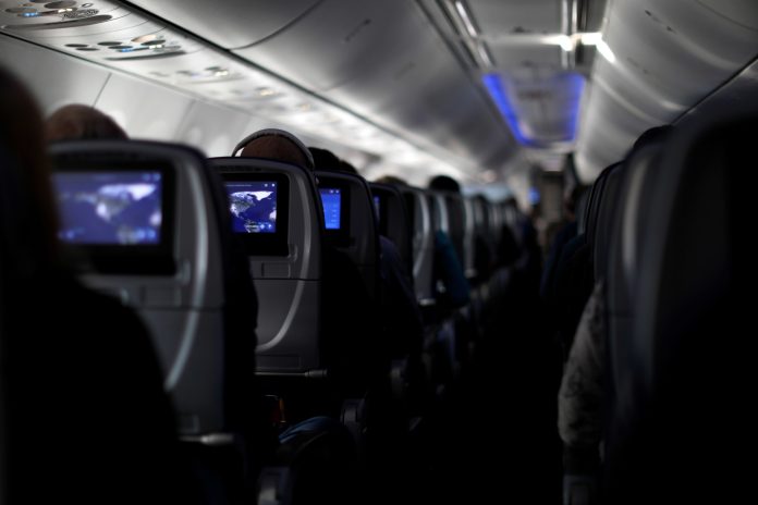 The passenger cabin on a Delta Boeing 737-900ER is shown while landing in Salt Lake City, Utah.