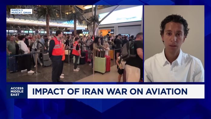 Aviation analyst Alex Macheras says disruption in the Gulf has far-reaching financial implications as the region handles 10% of global international passengers. He discusses how airports in Doha, Dubai and Abu Dhabi collectively handle up to 500,000 passengers daily at peak seasons and how the loss of such foot traffic amid the Iran War, as well as the patchy picture of airspace closures and limited operations, all weigh on airlines.