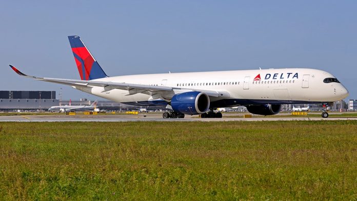 Delta Air Lines Airbus A350 widebody aircraft taxiing on a runway at an airport, with blue engines and red-and-blue tail livery visible against a clear sky.