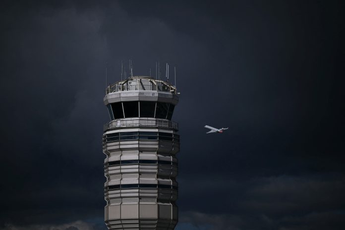 An airplane takes off the control tower at Reagan National Airport in Arlington, Virginia, on Oct. 8, 2025.