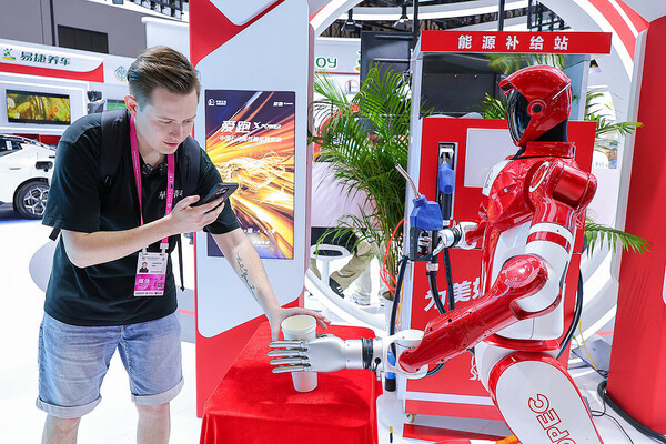 The 6th China International Consumer Products Expo was held on April 13, 2026 in Haikou, Hainan. A variety of intelligent robots were showcased at the expo. The photo shows a foreign livestreamer interacting with a smart service robot.